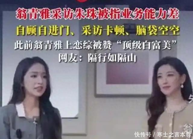 文丨禄       本想体面地维持高智双语的女性形象,却被一场采访打入了谷底。       翁青雅采访时的卡顿、尴尬,和礼貌得体、应对自如的朱珠形成了鲜明的对比。       让网友直呼:       “太尴尬,要抠出三室一厅啦”。       11񀙑日,网络上流传了一个采访视频,引起网友们的爆笑,纷纷表示这简直就是朱珠的“工伤”名场面。       因《心动的信号》而成名的翁青雅接到了一个采访朱珠的任务。       可搞笑的是,前一秒还礼貌敲门的翁青雅,在朱珠开门后竟然径直走了进去,头都没回。       独留一脸错愕的朱珠,仿佛是负责接待的小服务员,尴尬地看着只留下背影的翁青雅。       不过这错愕也就仅仅维持𱄾秒钟。       朱珠便快速反应过来,并笑着询问“他们(工作人员)不进来吗?”       本来这句话是给翁青雅打圆场的,却没想到翁青雅几乎没怎么理朱珠。       只小声说了句“不用”,就继续头也不回地走了。       看到询问无果后,朱珠也只能尴尬地关上门,然后笑着跟了上去。       可到了沙发这里,翁青雅仍旧自顾自地坐了下去,一点儿让让朱珠的意思都没有。       主持人比嘉宾先入座,这场面还真是没看过。       好在朱珠全程保持礼仪和优雅,倒是微笑面对,没有任何黑脸的地方。       除了这尴尬的见面之外,之后的采访也可以称得上是       “年度尴尬采访名场面之最”       。       翁青雅在采访的全程中,要么卡顿看提词器,要么低头看手稿找问题。       整个采访的过程一直不顺畅,问的问题也是莫名其妙。       为了让节目顺利进行,作为被采访人员的朱珠,只好要做起了主持人的工作。       一会儿问她是不是想问这个,一会儿又要给她那中英混杂的提问找补。       朱珠一人干了两人的活儿,网友隔着屏幕都能看到现场的尴尬。       要知道,翁青雅在真人秀中可是以“高智的白富美形象”而被关注的。       据她自己介绍,她是毕业于伦敦大学,并学习传媒专业的。       可在采访中,她的英文并没有想象中好,且采访功底非常差,几乎看不出是传媒系的学生。       不过也有人说,这个伦敦大学的传媒系是学习广告、多媒体的,并不是播音主持。       可既然拿到了主持的工作,那是不是就表示至少这段采访应该是流畅的呢?       而且就开场的那段视频中,翁青雅毫无礼仪和礼貌可言,这可跟是什么专业的没有关系吧。       反观朱珠,一路几乎都在暖场,且仪态优雅大方,和翁青雅形成了鲜明的对比。       其实,朱珠早前是音乐节目主持人出道的,且还是双语的节目。       自己更是曾在美国留学,堪称真正的高智白富美。       这可是翁青雅所不能比的。       看到舆论持续发酵后,深知自己犯错的翁青雅主动发文表示了道歉。       朱珠也及时回应她“已翻篇儿”,没有丝毫埋怨。       可就是这样一句简单的道歉,却被翁青雅编辑得文字不通,实在看不出一丝文采。       这和她在节目上树立的形象完全对不上,这已经不是一句“紧张”就能解释的了。       在如今的娱乐圈,流量的确很重要。       可为了流量就胡乱编造人设,或者用流量来挑战专业,那可是会凉的很快的哟。